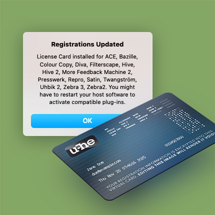 License Cards will be delivered by email from support@u-he.com whenever you purchase a compatible product, redeem a registration code, or access the My Licenses webpage. As they are regular .PNG image files, licenses can be backed up in most password managers or wherever you prefer to keep your important documents.