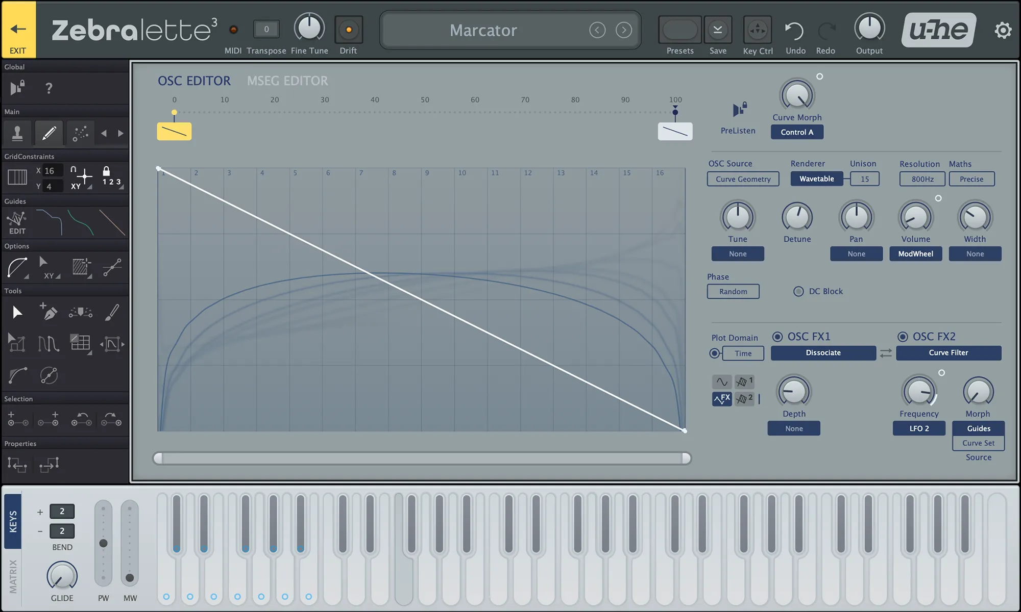 The Multi-Segment Envelope Generator is extremely flexible. Create up to seven MSEGs and morph between them. Use the same versatile editing tools as in the OSC editor to draw envelopes, modulation shapes or even sequencer-like patterns using the grid. Add, remove or reposition breakpoints, adjust curvature or snap to the grid. Each MSEG can be looped using freely adjustable loop points.