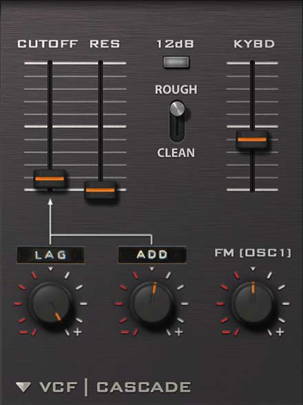 With three oscillators, Triple VCO is the largest of the oscillator panels. Waveform shape selection is continuous rather than discrete: choose ramp, triangle, sawtooth, square or any position inbetween for hybrid shapes. Try out frequency modulation (FM), oscillator sync, waveform modulation for striking tones. Use feedback to route post-filter sound back into the oscillator mixer for effects ranging from mild bass boost to subharmonics / low-frequency howling.
