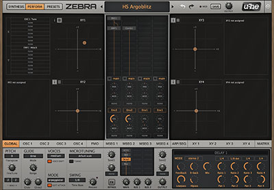 Up for a live performance? Zebra’s Perform panel includes four X/Y pads which can control up to 16 parameters each, all at the same time.